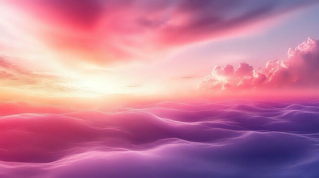 Dreamy pink and purple cloudscape with rolling waves of fog at sunset, creating an ethereal atmospheric landscape with vibrant sky gradients and glowing sunlight.