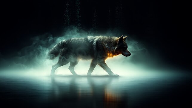A wolf is standing in a forest with a glowing aura around it. The image has a mystical and ethereal feel to it, as if the wolf is a mystical creature from another world