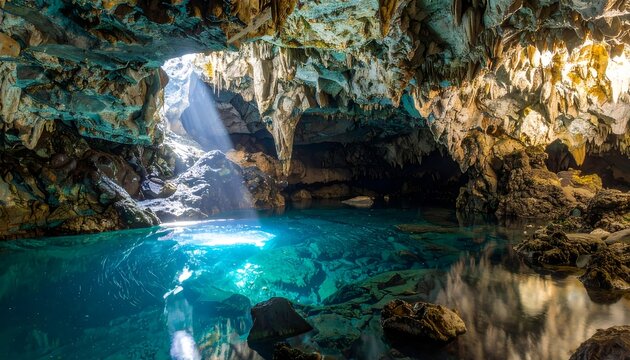 View of mystical flooded cave with beautiful limestone formations and serene reflections, Hang Son Tra, Vietnam.