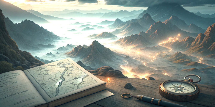 Elaborate fantasy map spread on an ancient table glowing runes hidden paths mythical creatures lurking rich colors intricate details