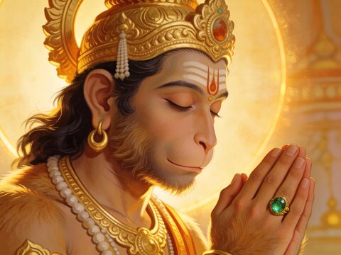 Hindu god Hanuman meditating reverently with hands in prayer, adorned with a golden crown and illuminated by divine light.