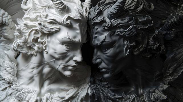 Contrasting faces of angel and demon in high-detail sculpture, monochromatic artistry