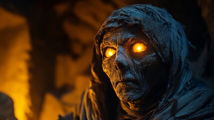 Close up of a hooded figure with glowing orange eyes in a dark and shadowy environment setting look scary