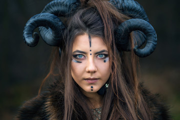 Outdoor portrait of beautiful scandinavian viking woman warrior with blue eyes wearing ram horns looking at camera. Female hunter with specific makeup wearing fur collar