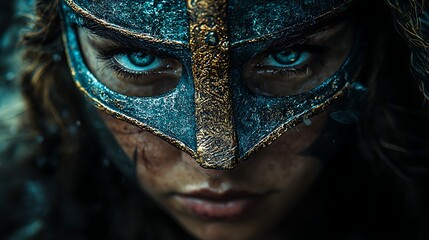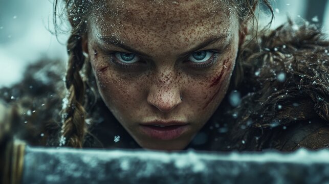 In the heat of battle, a woman warrior wears a rag cloth that's been covered in blood and mud.