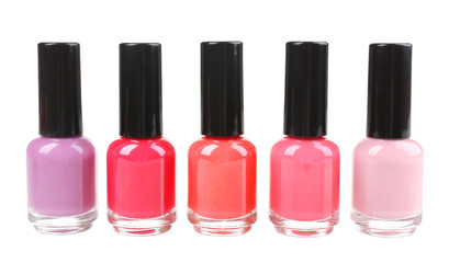 Pink and Purple Nail Polish Clear Bottles Dripping with White Background