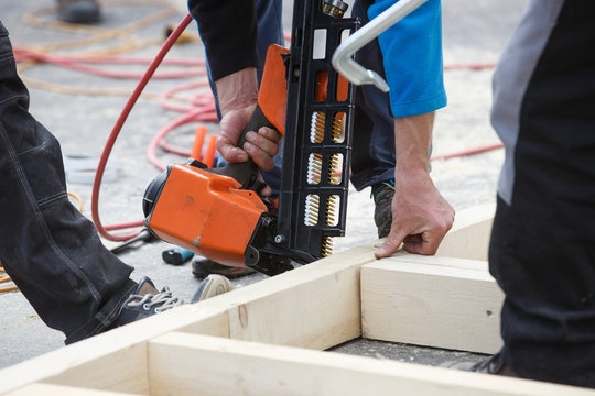 Professional carpenter using pneumatic nail gun