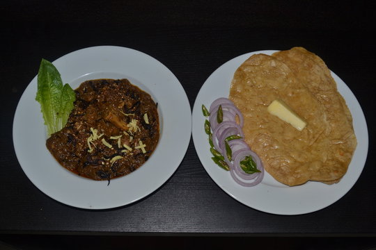 Overhead view of fragrant nalli nihari garnished with coriander leaves and served with naan, aromatic, curry, nihari