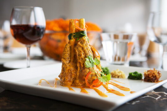 Lamb nihari, pakistani curry cuisine with garnish rice closeup on the wooden board on the table. Horizontal top view from above