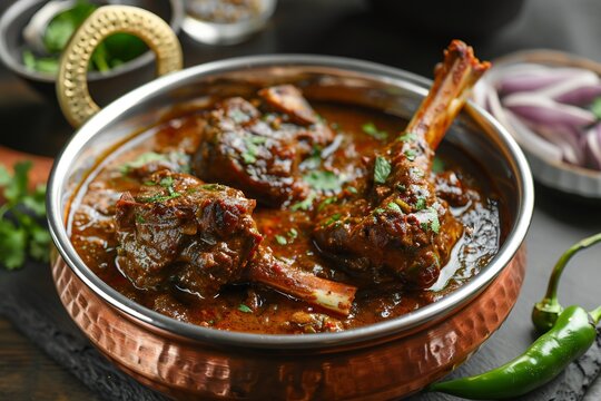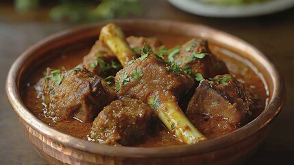 Indian Nalli Nihari in copper pot, rich dark gravy, tender lamb shanks, coriander garnish, clean presentation with rustic texture