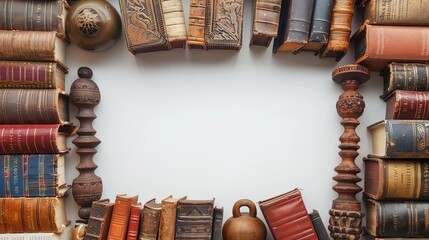 History artifacts and books creating a border, blank space inside, education border, historical