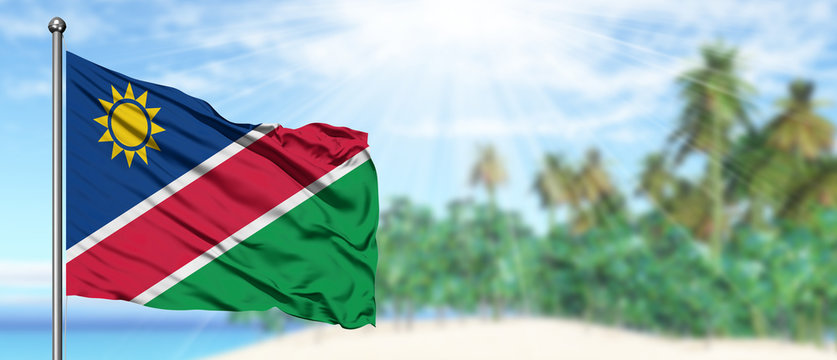 Waving Namibia flag in the sunny blue sky with summer beach background. Vacation theme, holiday concept.