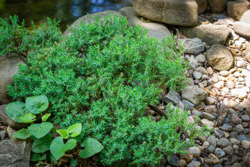 Original creeping Juniperus Procumbens Nana on stones by pond shore. Close-up of beautiful small japanese juniper procumbens Nana. Selective focus. Nature concept for spring design