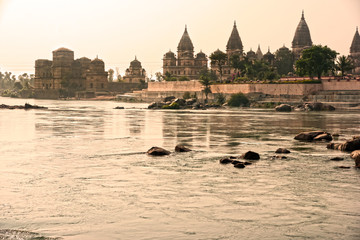 Madikeri, India - October 31, 2013: Closeup on small white and gray Guru Rudrappa mausoleum with bull statue on top, set in green garden of domain Raja Tombs. Shot form roof.