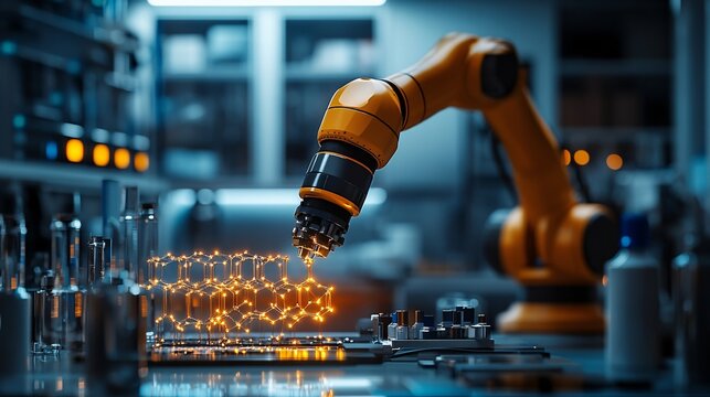A futuristic robotic arm designing intricate nanostructures in a high-tech lab