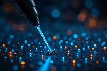 AI generated digital artwork showing advanced nanotechnology with robotic arms emitting blue laser beams onto glowing nanostructures symbolizing futuristic bioengineering
