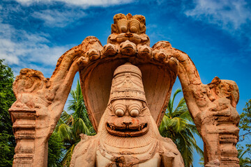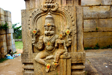 narasimha lakshmi temple hampi antique stone art close up shot from unique angle with amazing sky