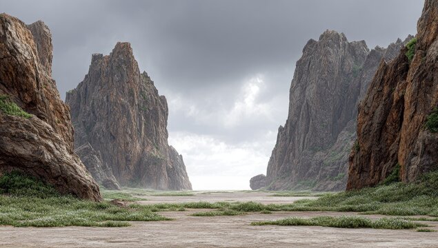 Narrow rocky canyon with steep striated cliffs under moody cloudy sky creating a dramatic and mysterious atmosphere