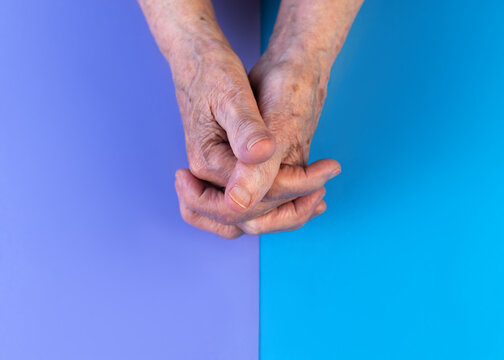Hands of elderly woman crossed on blue and violet background. Arthritis Awareness Month concept.