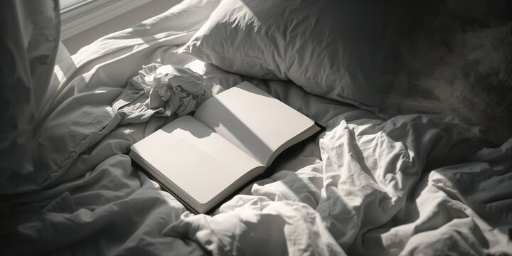 Monochrome journal open on a desk surface, serving as a UI backdrop for writing projects, National Writing Day