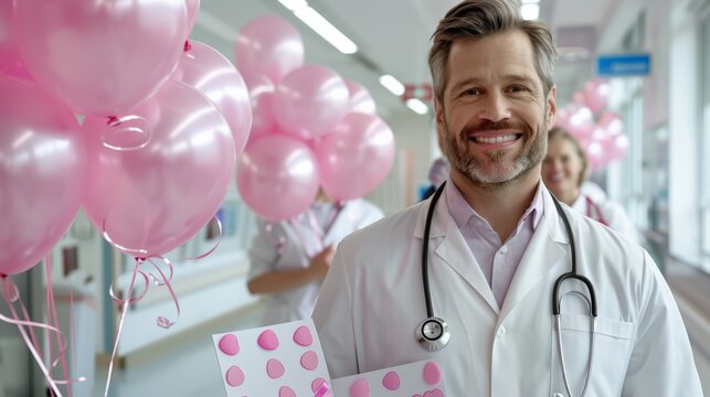 National Physicians Week. Group of smiling medical professionals celebrating in a hospital.