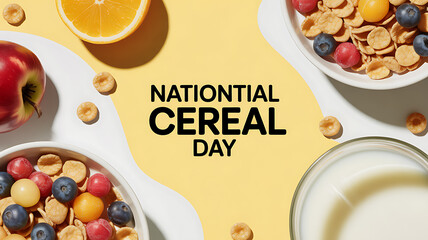 National Cereal Day celebration with bowls of cereal, fresh fruit, and milk on a bright yellow background