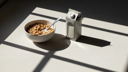 Healthy breakfast setup with cereal and carton of milk on table for National Milk Day