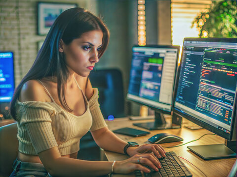 A focused Caucasian woman engrossed in coding under twilight hues, evoking National Computer Science Education Week mystique