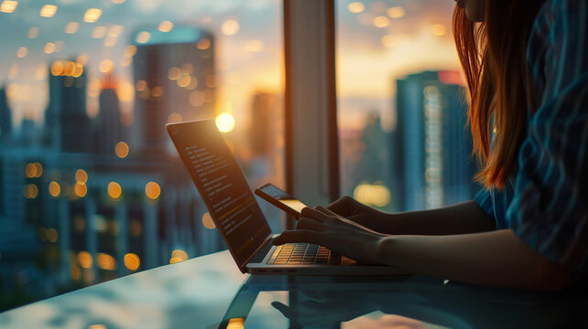 Focused Woman Working on Laptop and Smartphone in Modern City Office with Stunning Evening Skyline, Emphasizing Urban Professional Life and Technological Connectivity