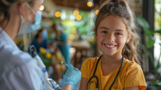 Healthcare Professionals Administering Vaccine to Child at School During National Immunization Awareness Month to Promote Public Health and Prevent Diseases