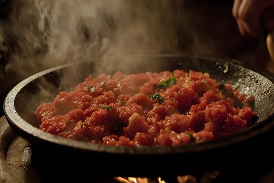 Close-up of a skillet with sizzling ingredients, steam rising, with simple kitchen decor in the background. National Men Make Dinner Day.