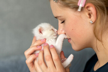 Young caucasian woman gently holding adorable white kitten close to face. National Cat Lovers’ Month
