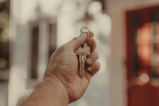 Joyful New Homeowner Holding House Keys, Celebrating National Homeownership Month, Daytime Outdoor Setting