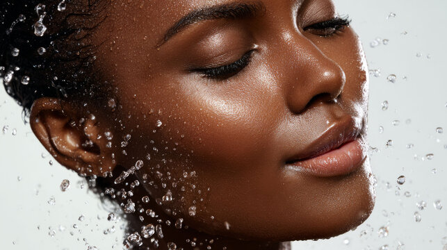 Beautiful woman with glowing skin enjoys refreshing water splash, expressing calm and relaxation in close up portrait