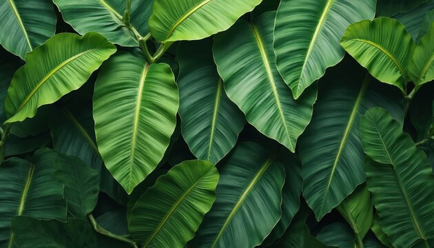 Overlapping green banana leaves create dense jungle canopy texture. Sunlight filters through large tropical foliage, natural patterns, organic growth in vibrant display of plant life.