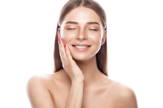 Beautiful young girl with a light natural make-up and perfect skin. Beauty face. Picture taken in the studio on a white background.