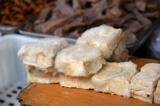 Closeup of naturally fermented moldy tofu at a farmers market