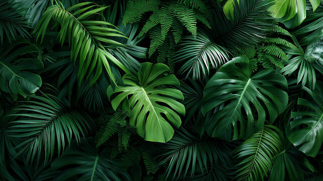 Dense tropical green leaves forming a lush natural background with rich texture and depth.
