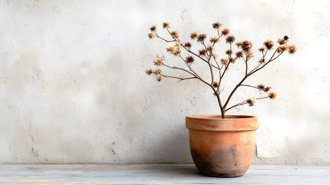 Dried plant in pot against rustic white wall background, offering a minimalist nature aesthetic for design projects.