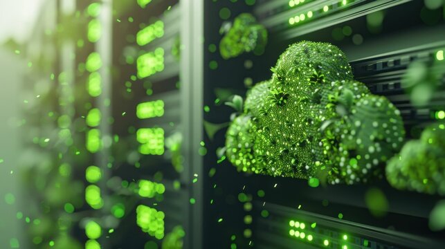 Eco-friendly data center with digital processing icons