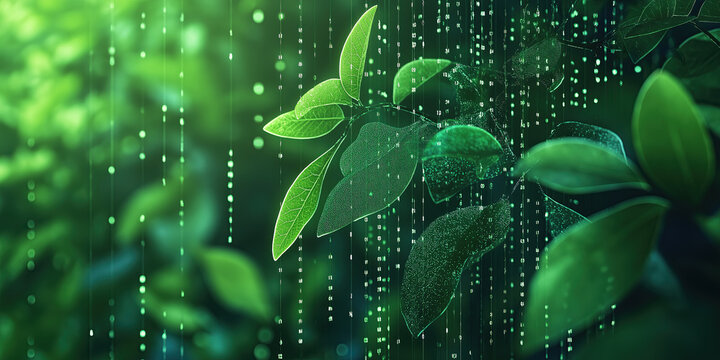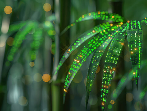 Digital Nature Fusion Abstract Representation of Technology and Nature with Green Binary Code Overlay on Palm Leaves for High Tech Backgrounds and Environmental Concepts