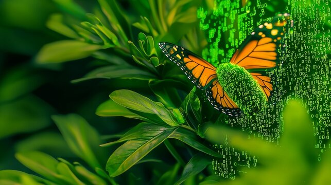 Butterfly on Green Leaves with Digital Data Overlay Symbolizing Nature and Technology Integration