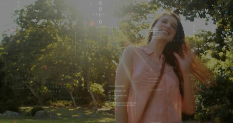 Standing adult woman wearing sleeveless pink blouse in sunlit garden, with code overlay, copy space