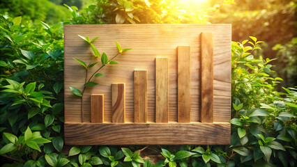 bar graph carved into textured wood, surrounded by lush greenery, symbolizes growth and progress in natural setting. sunlight enhances serene atmosphere