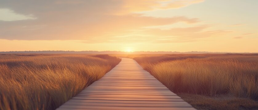 A long wooden boardwalk extends toward a sunset-lit horizon, surrounded by golden marshes, evoking a sense of wanderlust and endless possibilities.