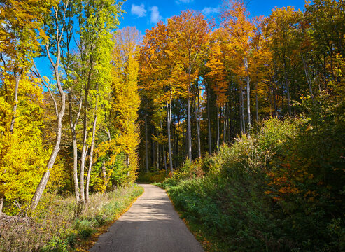 Curving road through colorful autumn forest leading to the Csókás Camp in the Bükk Mountains, Hungary, under bright blue sky.