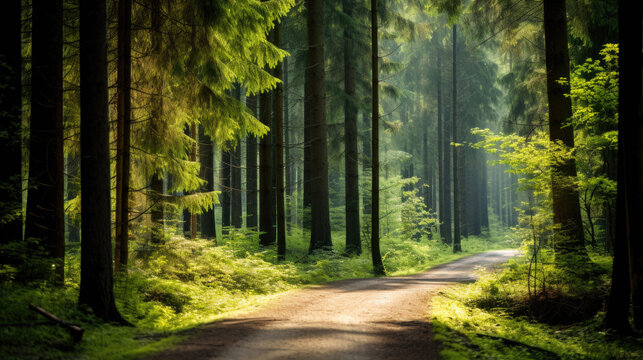 Male hiker walking into the bright gold rays of light in a misty forest, landscape shot with dramatic beautiful lighting mood