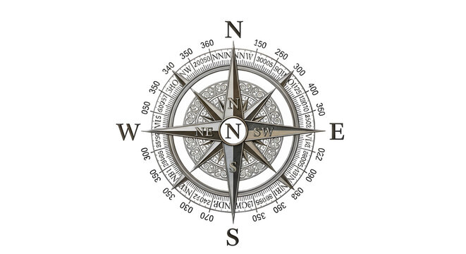 Detailed compass rose illustration with intricate design, featuring cardinal directions and degree markings, isolated on transparent background, perfect for navigation or cartography projects