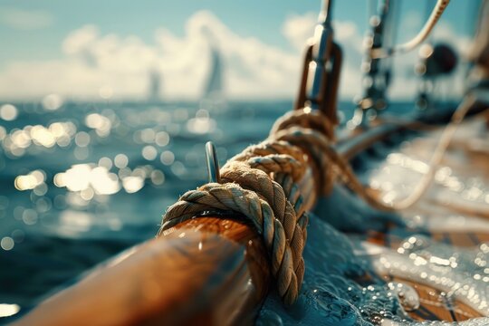 A table setting with a rustic, nautical theme on a wooden background with copyspace for text