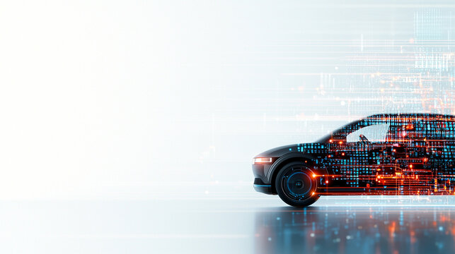 A highly detailed illustration of an autonomous vehicle navigating through a smart city, with glowing sensors and data streams representing its connection